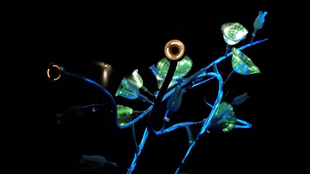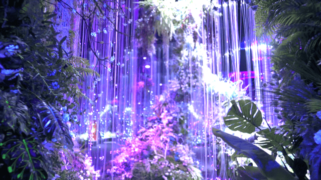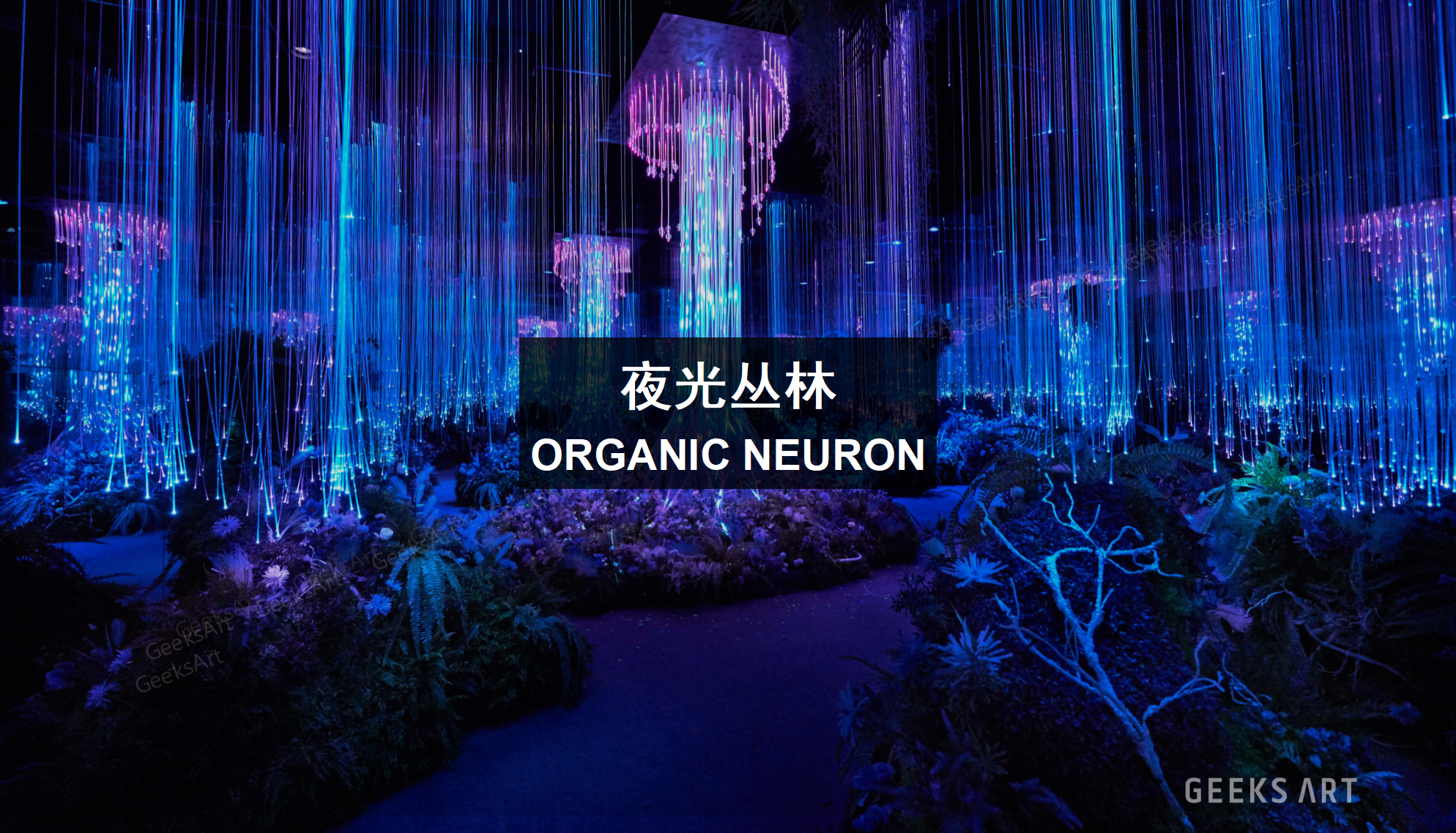 万物是相连的一个有机生命体。在“人类中心主义”的傲慢里,我们逐渐失去了与大自然的连结,也逐渐失去了与自己的连结。我们站在一片夜光丛林,人的意识与自然的存在开始缠绕与连结。植物是有神经电动的单位,它沿着思维的轨迹螺旋式的扭曲、攀爬与飞跃,逐渐衍化出与人类具有同一性的遗传结构。我们尝试用这个作品来启发大家重新审视全球化语境和科技飞速发展的时代,我们对于自身在生态环境系统之中所处的位置。关于人与环境之间的关系的思考,呼唤对于我们生命源头的敬畏,以及对于 “意识” 的探索与认知。