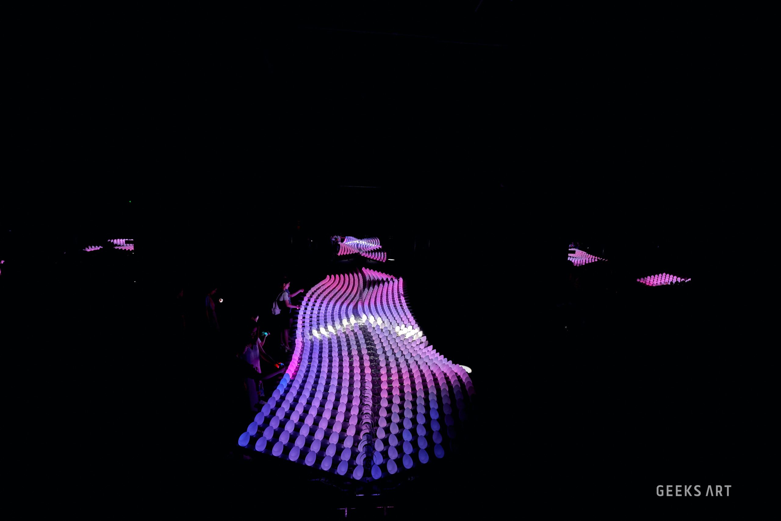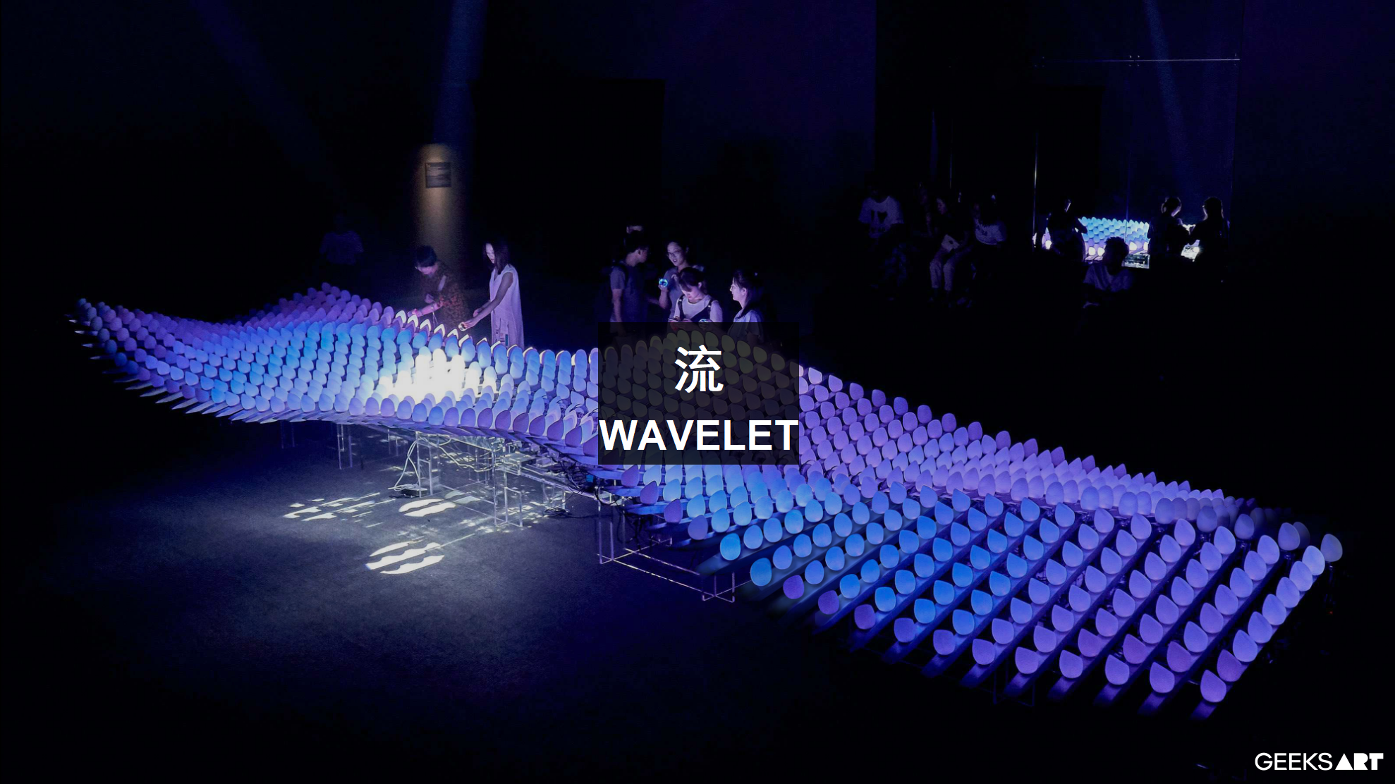 作品由1000个半弧形的水滴感应灯组成。当我们用光源靠近点亮其中一颗“水滴”,它犹如涟漪一般迅速传递扩散开去,你的光与他人的光在这一刻交融,点亮彼此,流动成意识的海洋。我们的生命是流动着不断变化的,万物皆是一种流动。在流动之中我们感受到生命的本质,它犹如中国传统朴素的道教思想中所说的“顺势而为”的宇宙大道,它是从“无”到“有”,又从“有” 到 “无”的此消彼长,是天地之间元亨利贞能量流动不息。生命中的互相作用如同水的涟漪扩散,所有人都不是孤立割裂的存在,万物都是息息相关的一个整体,每一个点点滴滴的举动,都在彼此之间有着深远的影响。正如诗人William James的诗说的那样“我们是海洋之中的岛屿,表面上分开,却在深处彼此相连”。《流》是融合感光系统&点控系统的艺术作品,这一次的亮相将从核心硬件、材料、造型、表现、交互形式上升级,特别是在表演模式上的重点突破,量身定制了音乐与场景,在短短4分钟里,讲述了一段关于“生命流动”的磅礴史诗。