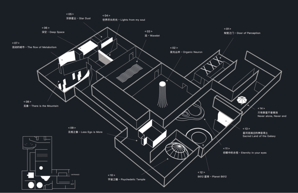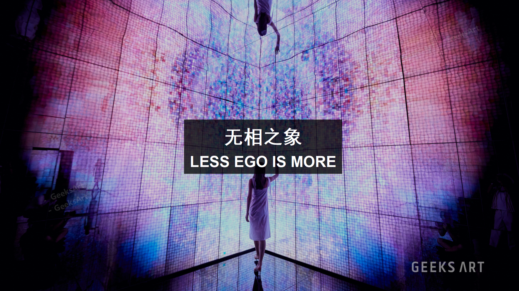 “无相”这个概念最初来自于老子”绳绳兮不可名复归于无物。是谓无状之状无象之象是谓忽恍。” 在佛法里“绝真理之众相名无相”。我们在这里取了“恍惚”的幻境以及万物本质无相之意。这个用镜面像素屏所创作的沉浸式数字作品打破了日常经验里对于时间空间的传统认知,也同时暗示着平行宇宙。在这里遇见无数个自己,也可能在幻象中迷失自己--Less ego is more,当我们放下“自己”存在感的执念之时,意味着另外一种辽阔的可能性,让我们得以为真实的“自己”留出空间,进入内心世界去探索更为丰富的浩瀚星辰宇宙。如同当代艺术之父杜尚在1957年某次演讲里说的那句话:穿越时空的迷宫,他寻找着一个清晰的出口。