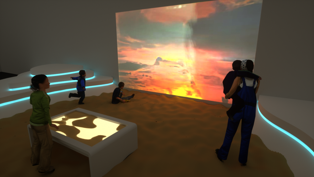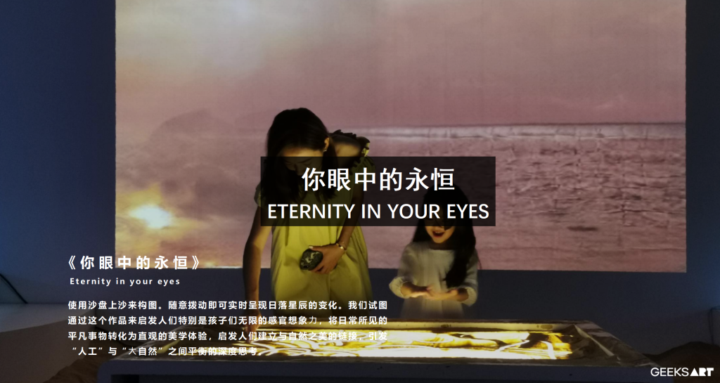 使用沙盘上沙来构图。随意拨动即可实时呈现日落星辰的变化。我们试图通过这个作品来启发人们特别是孩子们无限的感官想象力,将日常所见的平凡事物转化为直观的美学体验,启发人们建立与自然之美的链接,引发“人工”与“⼤自然”之间平衡的深度思考。