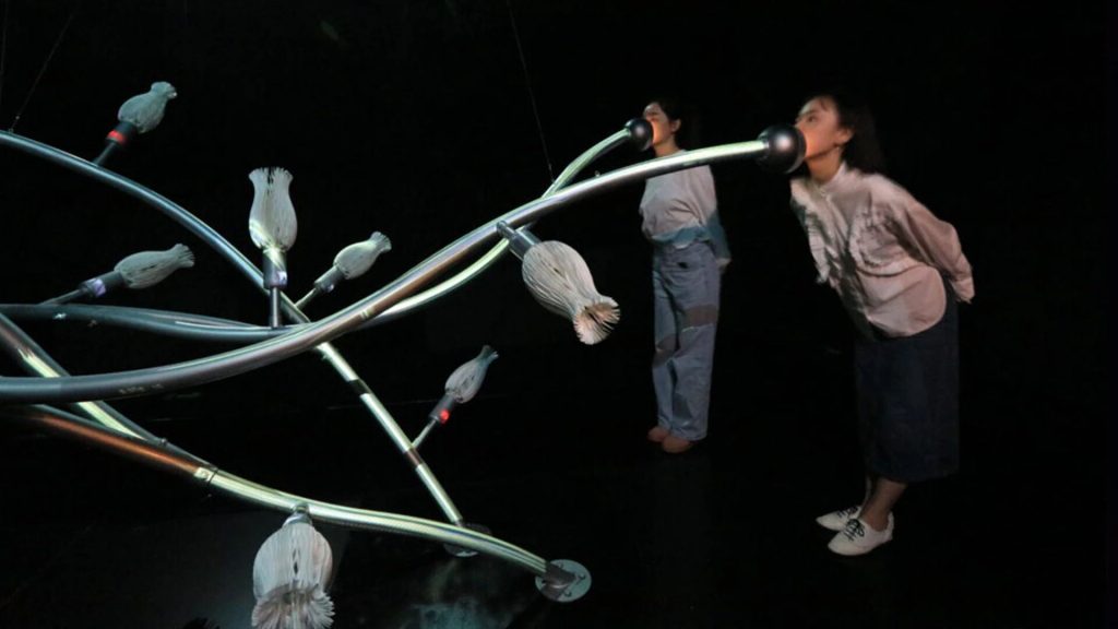 互动方式:观众站在指定的互动区域, 对着装置吹起, 就会发现有光影随着吹起的大小有相应的变化.