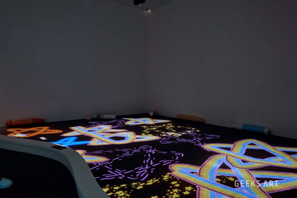 互动方式:观众在平板上随意画图, 并且把图片上传到墙面, 当墙面的图形全部填满的时候, 会发现是一副巨大的画作.