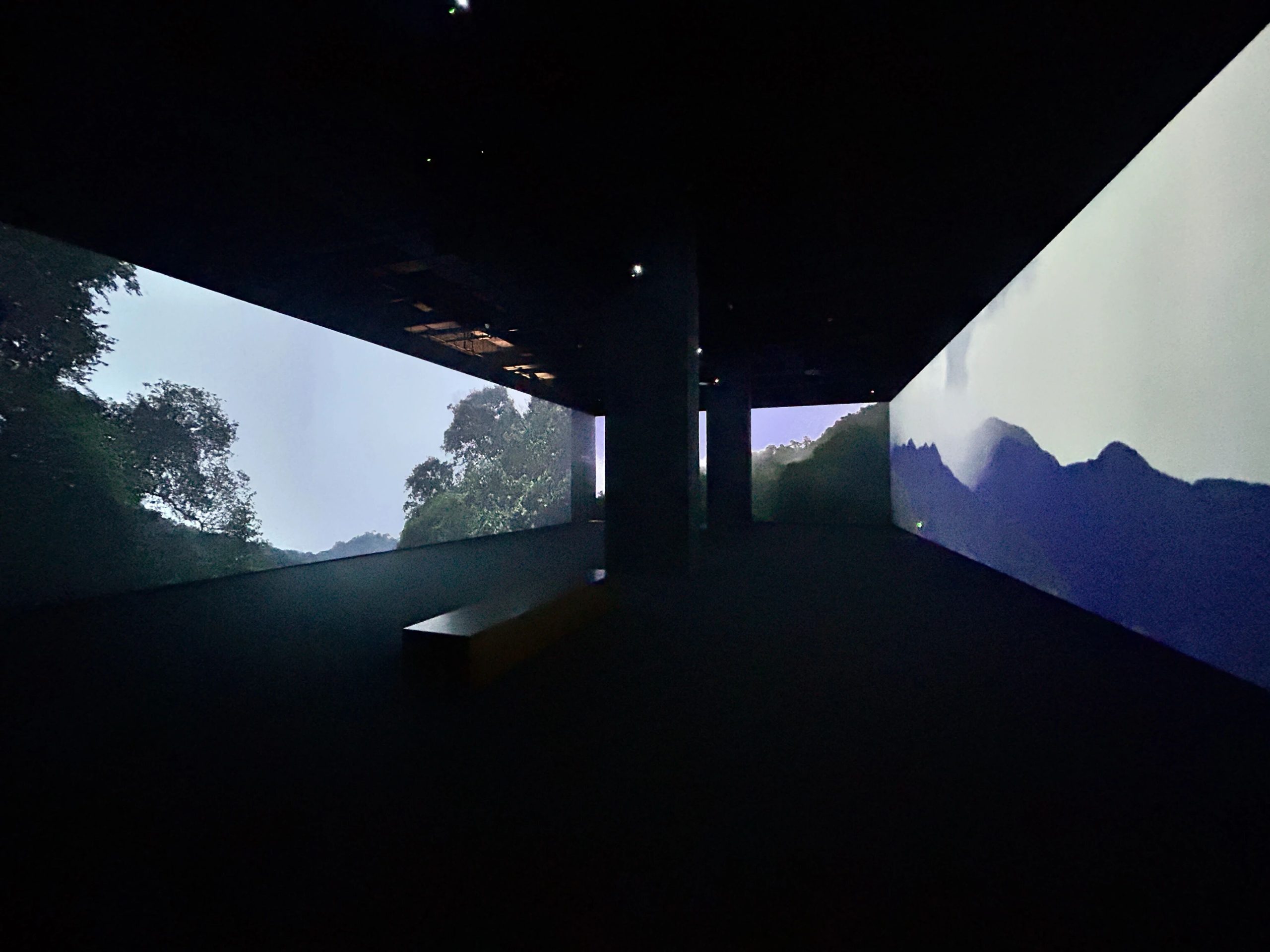在「青山无尽-绿美广东新媒体创作展」中,新媒体艺术以其独特的表达方式,重新诠释了岭南地理与文化母题,打破了传统图像性山水的表现形式,构建了一种创新的数字生态叙事。展览的空间设计巧妙地融合了岭南山水的自然元素与数字技术,营造出一个多维度的感官体验场域。