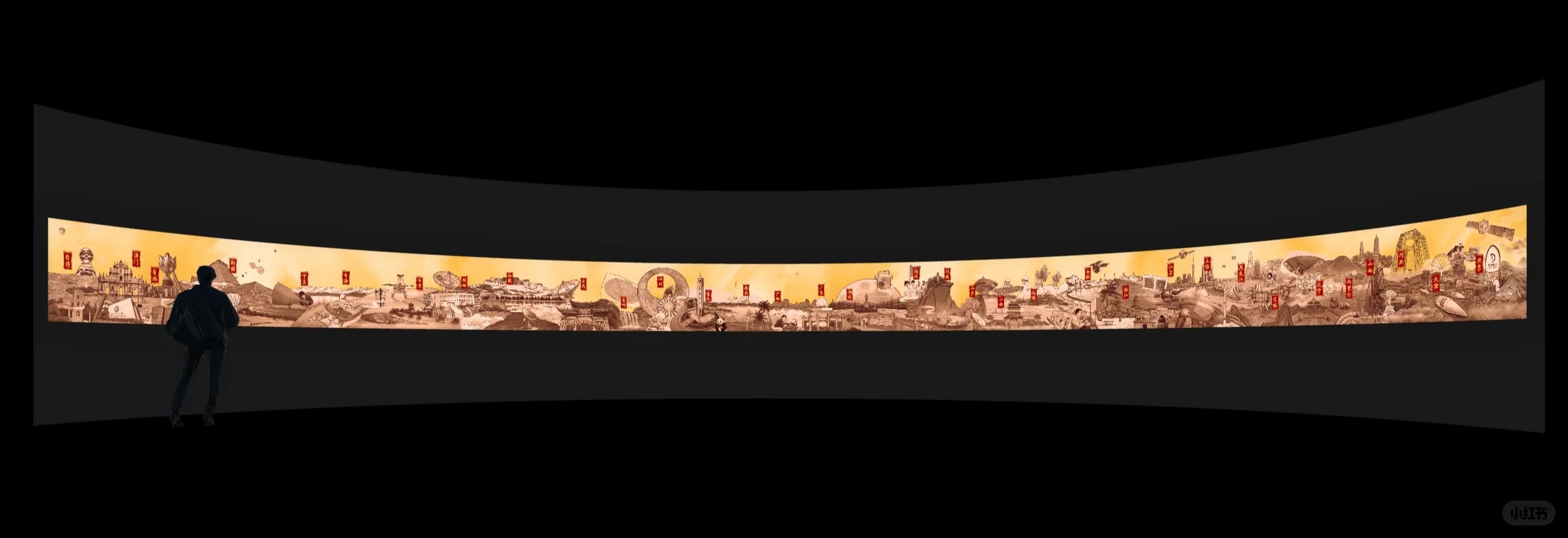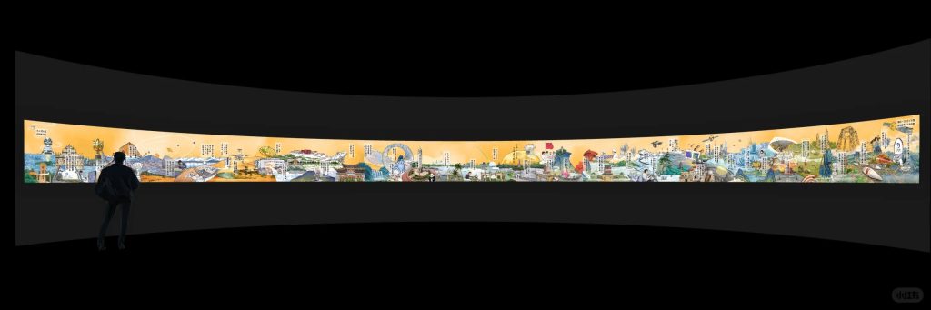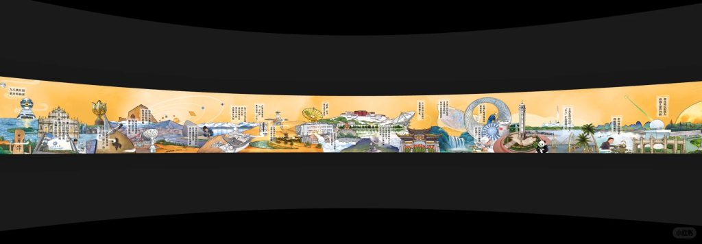 由于本项目关系国家形象,审批与审核程序极为严苛,每一处文字、画面与细节均需反复校审,容不得丝毫疏漏。特别是考虑到展项展示区域的尺寸限制(高度仅1米,横向延展20米),团队精确控制文字数量与画面信息密度,在确保清晰可读的同时,最大限度传递丰富内容。