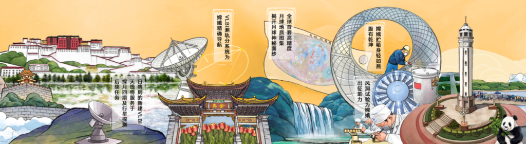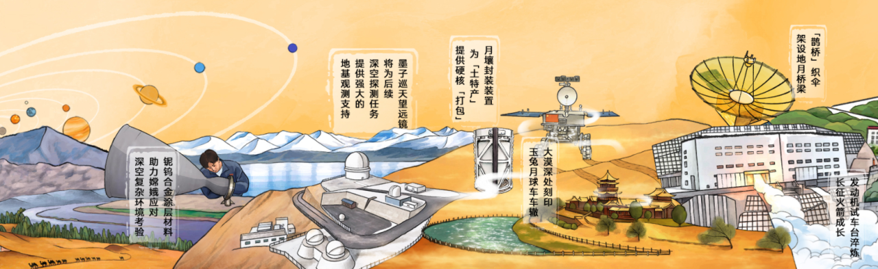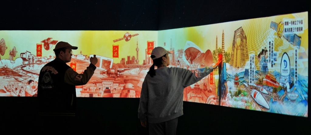 长达20米的交互长卷精选文化与科技地标,生动描绘中华儿女以举国之力托举探月梦想的壮阔场景。观众可通过触摸互动,点亮每一处地标背后的故事,沉浸式感受亿万人民托举嫦娥飞天的磅礴力量。