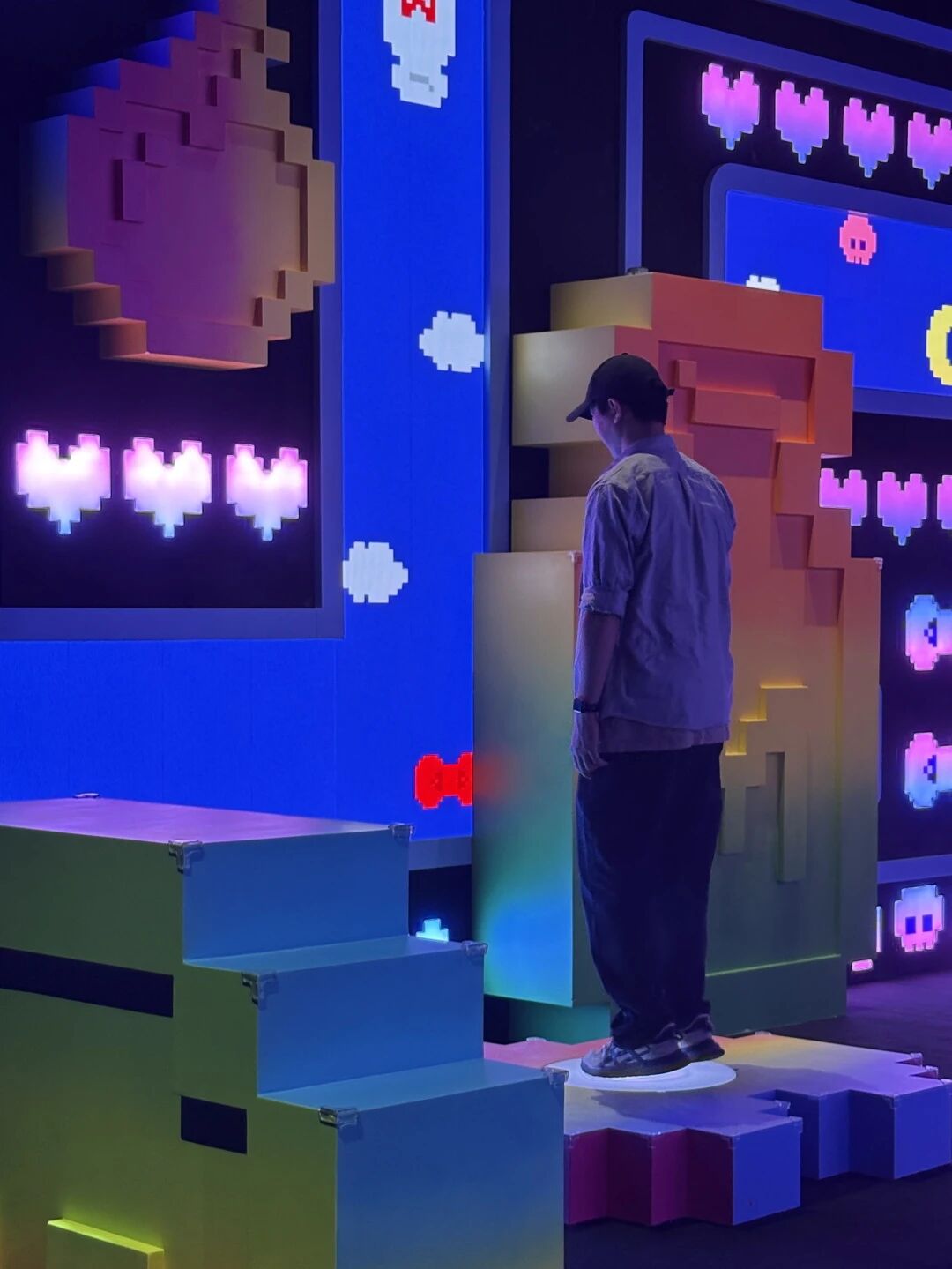 在场景设计上,现场有一个近10米高的巨型苹果装置作,观众可以走进这个巨大的苹果里,感受虚实交织的光影世界。在许愿流沙中,蛋糕、蝴蝶结等经典元素悉数登场,利用交互装置实现了观众与艺术作品的甜蜜互动。而复古游戏机和像素风的互动体验设计,让Hello Kitty所承载的儿时的记忆扑面而来。
