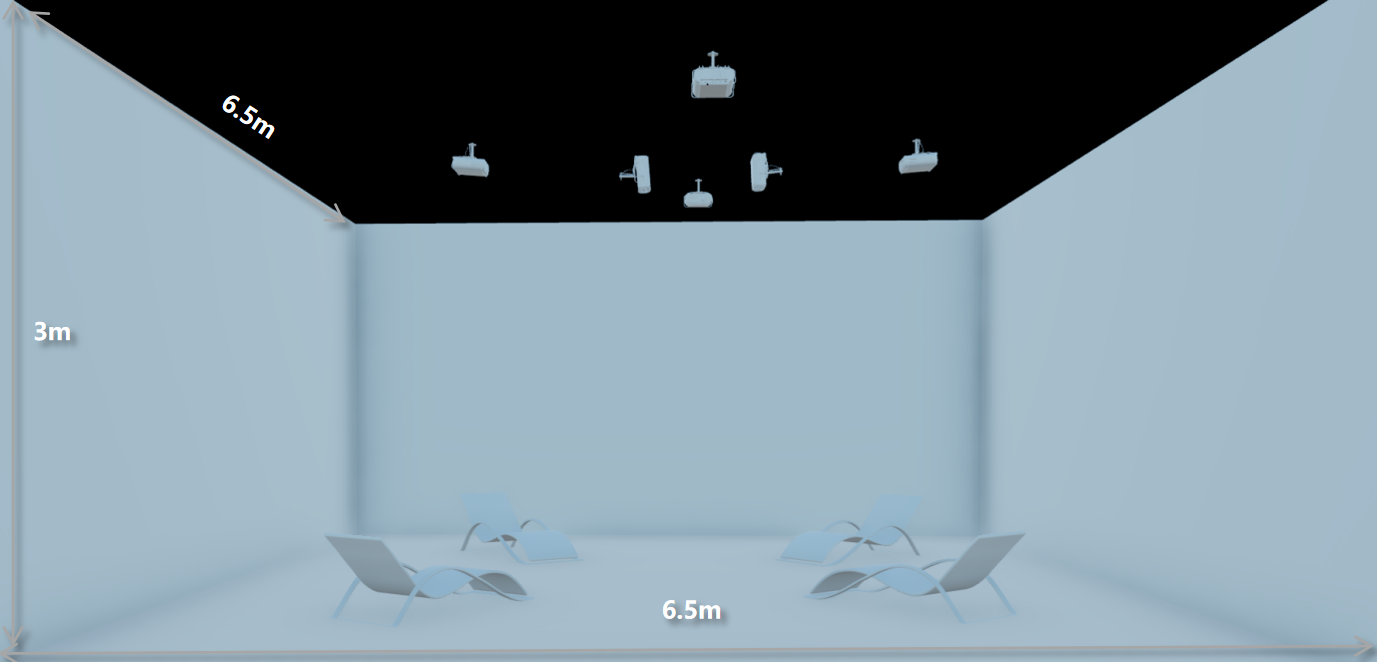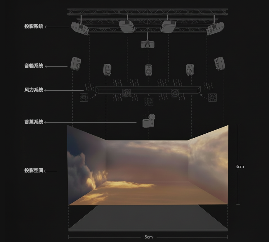 1 硬件要求: 场地为约40-50㎡、层高4米的独立空间。我们提供含风感、气味装置在内的标准化多感官硬件系统。